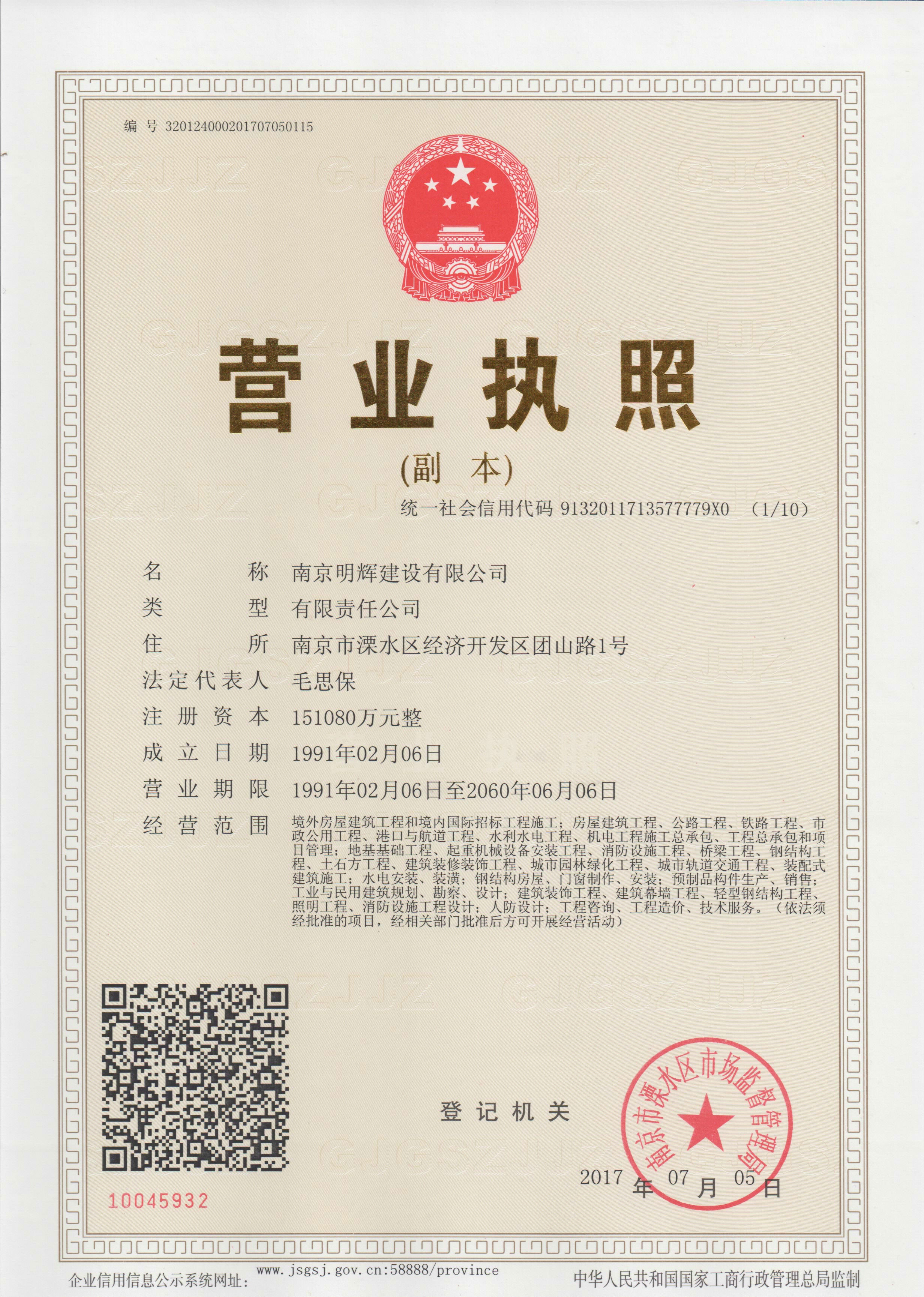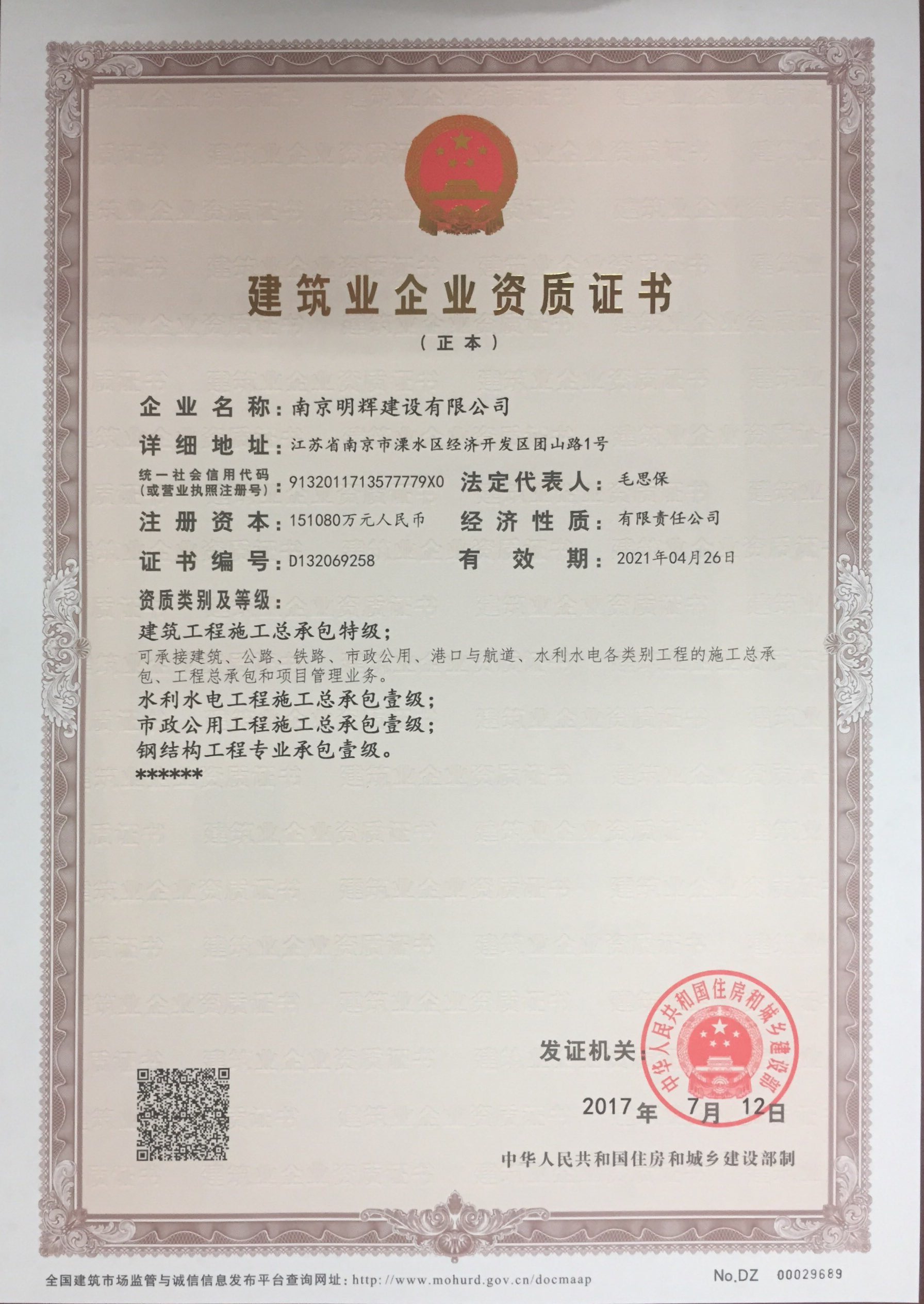 明辉集团公司现具有建筑施工总承包特级资质,建筑行业甲级设计资质;市政公用工程总承包、水利水电施工总承包、地基和基础、建筑装修装饰、钢结构专业承包5项壹级资质;桥梁和公路工程2项贰级承包资质。可承接建筑、公路、铁路、市政公用、港口与航道、水利水电各类别工程的施工总承包、工程总承包和项目管理业务。
