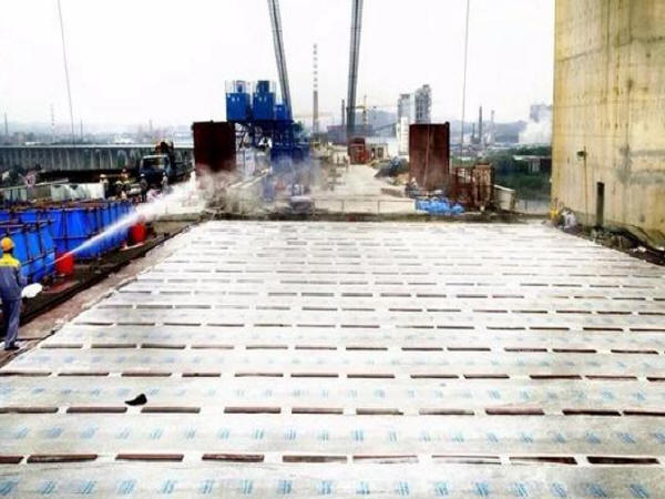 由于是国内第一次大面积采用该技术,摊铺面积达65000m2,为保证质量,大桥开始STC首件浇筑前,洞庭湖大桥公司对所有施工人员、材料、设备进行了严格检查;对从STC搅拌、布料、摊铺整平到覆膜湿养,每道工序都严格把关;对桥面清洁度、铺装层高程、厚度、横坡度、平整度等各项技术指标严格控制,确保了桥面铺装施工质量。