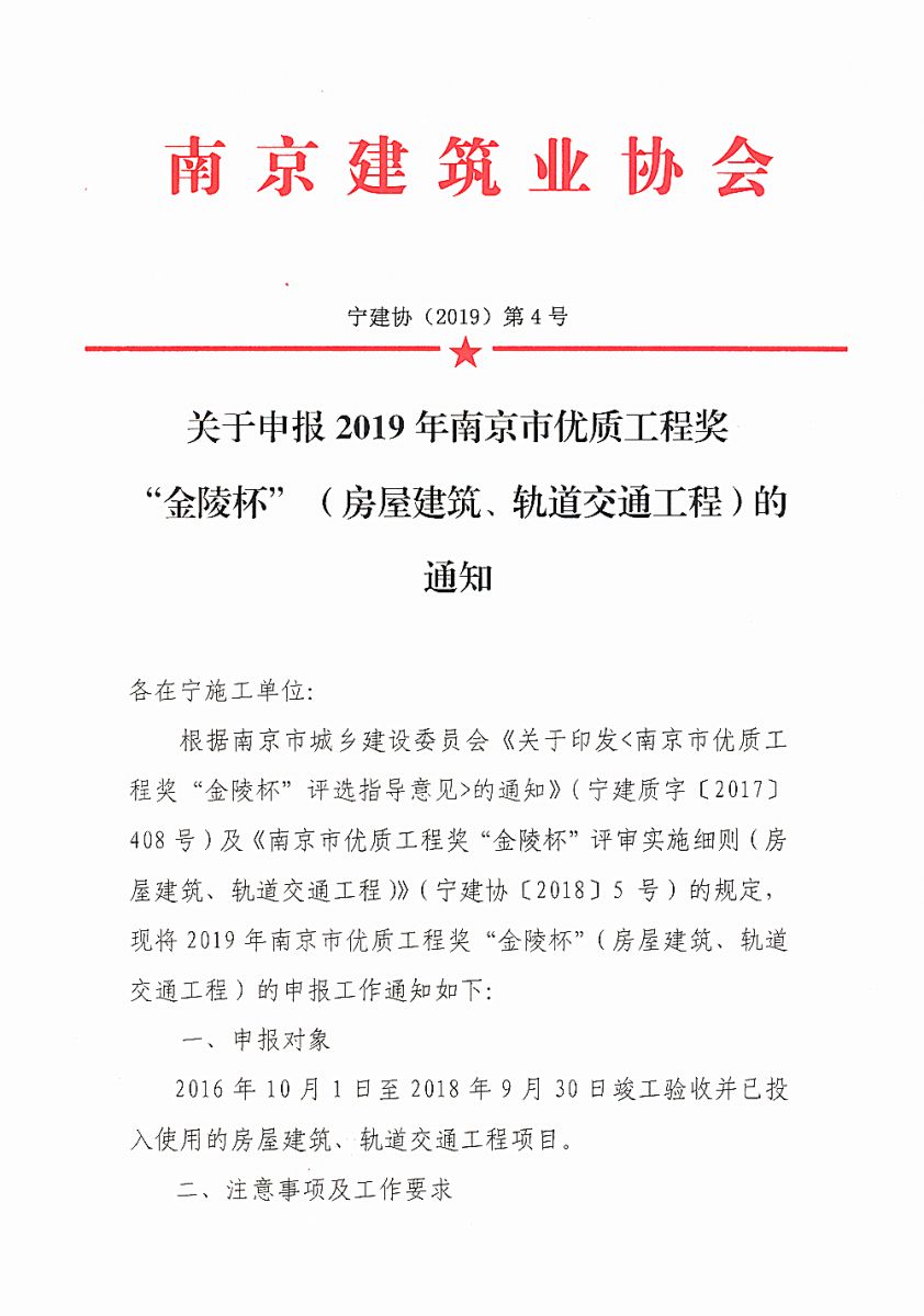 完美官方网页版申报2019年南京市优质工程奖“金陵杯”(房屋建筑、轨道交通工程)的通知