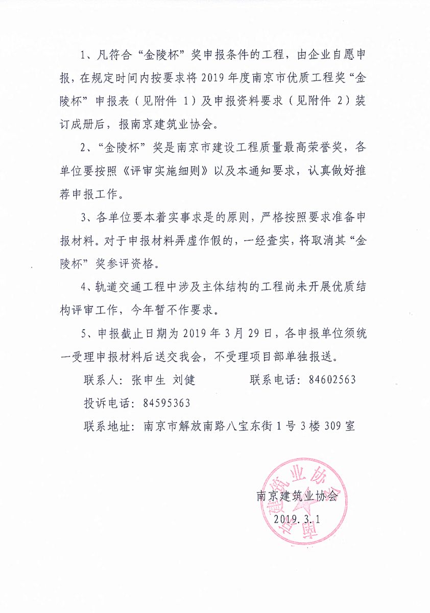 2019年度南京市优质工程奖“金陵杯”申报资料要求
